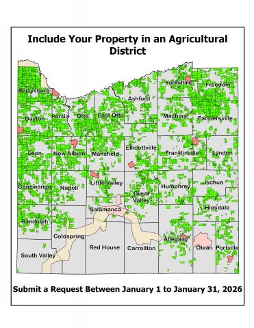 Agriculture and Markets Law Section 303-b was enacted in 2003 to provide for the designation of an annual 30-day period during which landowners may submit requests for the inclusion of predominately viable agricultural land into an existing certified agricultural district. Cattaraugus County has designated January 1 through January 31, 2026 as this 30-day period. Landowners seeking inclusion into a certified agricultural district must submit a “Landowner Request for Inclusion” form to the Cattaraugus County Department of Economic Development, Planning and Tourism by the January 31st deadline.