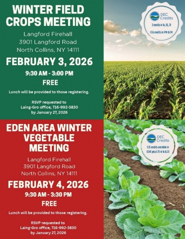 Laing-Gro, Division of Timac in collaboration with Cornell Cooperative Extension will be hosting their annual Winter Field Crop and Vegetable meetings in early February. These meetings, designed for field crop and vegetable producers will highlight industry updates and pesticide safety education for the 2026 growing season. DEC recertification credits will be available for attendees at each meeting. CCA continuing education credits will be available at the field crop meeting.