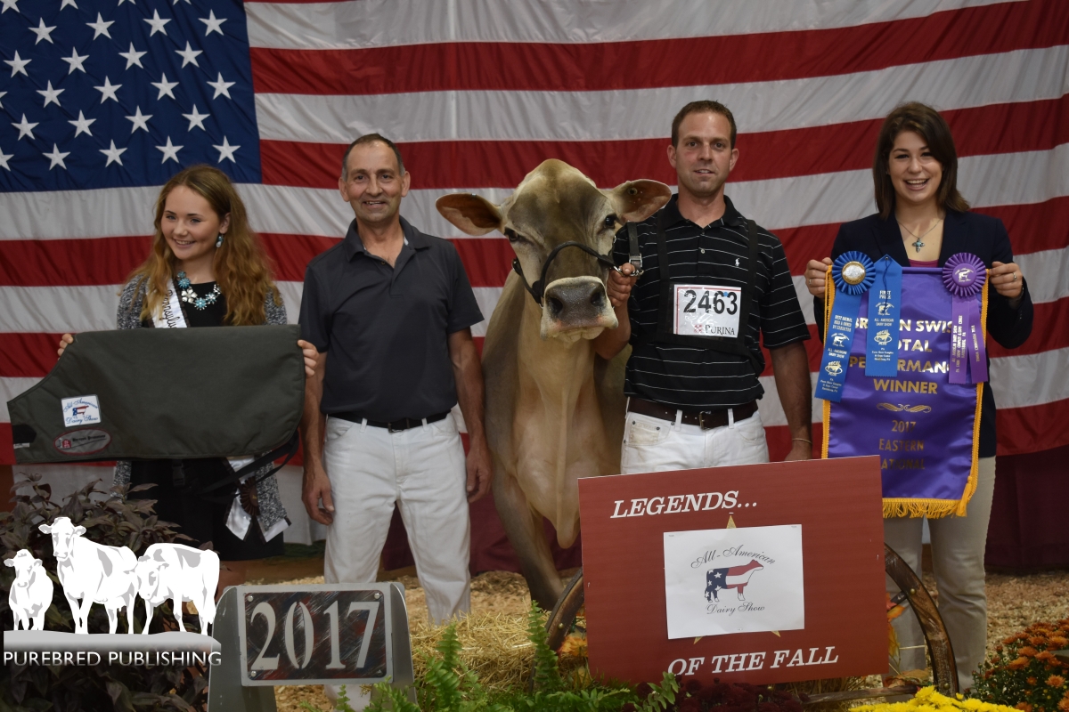 Hill’s Valley Farm was founded in 1959 by Roland and Onalee Hill. They sold the farm to their son Richard, and his wife Donna, in 1979. Roland continued to help with field work for many years. Roland’s FFA project was a Brown Swiss heifer, which ultimately led to today’s current herd of Brown Swiss. He passed away in August, 2017 at the age of 85. Richard and Donna have been involved in the farm since 1979. They raised two sons. Derek is a high school math teacher in Hamburg. He and his wife, Michelle, have two young children, Mackenzie and Gavin. Darin and his wife, Katie, have been partners in the farm since 2008. Katie hails from Perryville, Missouri and grew up on a Brown Swiss farm. Darin and Katie have three children; Blake, Garrett and Averi. Darin graduated from Cornell and Katie from the University of Missouri. The farm currently consists of nearly 300 head of mostly purebred Brown Swiss. The herd is one of the highest Brown Swiss production herds in the country with a herd average of over 25,000 milk and 1100 pounds fat. While production is an important part of the operation, Hill’s Valley farm is likely more widely acclaimed for the herd’s type. They have shown their cattle at local, state and national shows and have received many All-American recognitions. The most notable was a homebred cow, Hills Valley Perfecta Ritz, who was intermediate champion at both Harrisburg and the World Dairy Expo in 2011. Ritz has 25 daughters and granddaughters in the herd through the use of embryo transfer and invitro fertilization. The 2017 show season resulted in being Premier Breeder at Harrisburg and 3 All –American nominations. In addition Hill’s Valley bred, raised and sold the reserve Junior Champion at Madison which has been named All-American Fall Calf. The farm owns and rents 350 acres which produces all the roughage for the farm. The ration for the milk cows is corn silage, alfalfa and grass baleage, and purchased concentrate. Field work is shared by all family members, except corn chopping, which is custom harvested. The milking herd of 150 head is housed in a compost bedded pack barn which was built in 2008. The pack is bedded with dry sawdust and is stirred daily with an s-tine cultivator and cleaned twice a year. The herd is milked in an 8 stall step –up, walk through parlor retrofitted in the old tie stall barn. In 2016, Richard and Donna were recognized as the Active Master Breeder by the national Brown Swiss Association. Richard has served as a National director for the Brown Swiss Assocaition as well as Vice President. Richard has judged all 6 of the Brown Swiss National Shows including Madison in 2013. He currently serves on the FSA county committee and the board of directors of Upstate- Niagara Coop. Darin and Katie have been very active in the Cattaraugus County Farm Bureau. Darin currently serves as President and Katie is on the Pro-Ed Committee and is District 1 representative on the State Young Farmer and Ranchers Committee. They were the winners of the 2017 Young Farmers Achievement Award for New York State Farm Bureau.